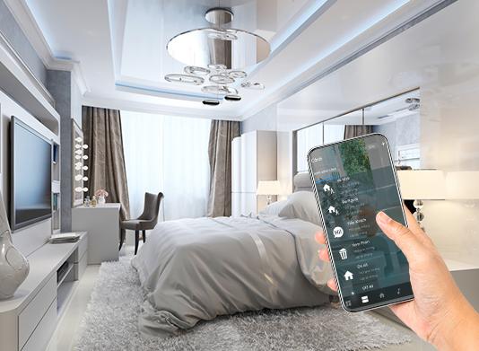 — Kích hoạt kịch bản “Đi ngủ”: toàn bộ rèm cửa sẽ tự động đóng lại, đèn phòng sẽ giảm dần độ sáng đến lúc tắt hẳn, hệ thống âm thanh phát những bản nhạc nhẹ nhàng đưa chủ nhà đi vào giấc ngủ.